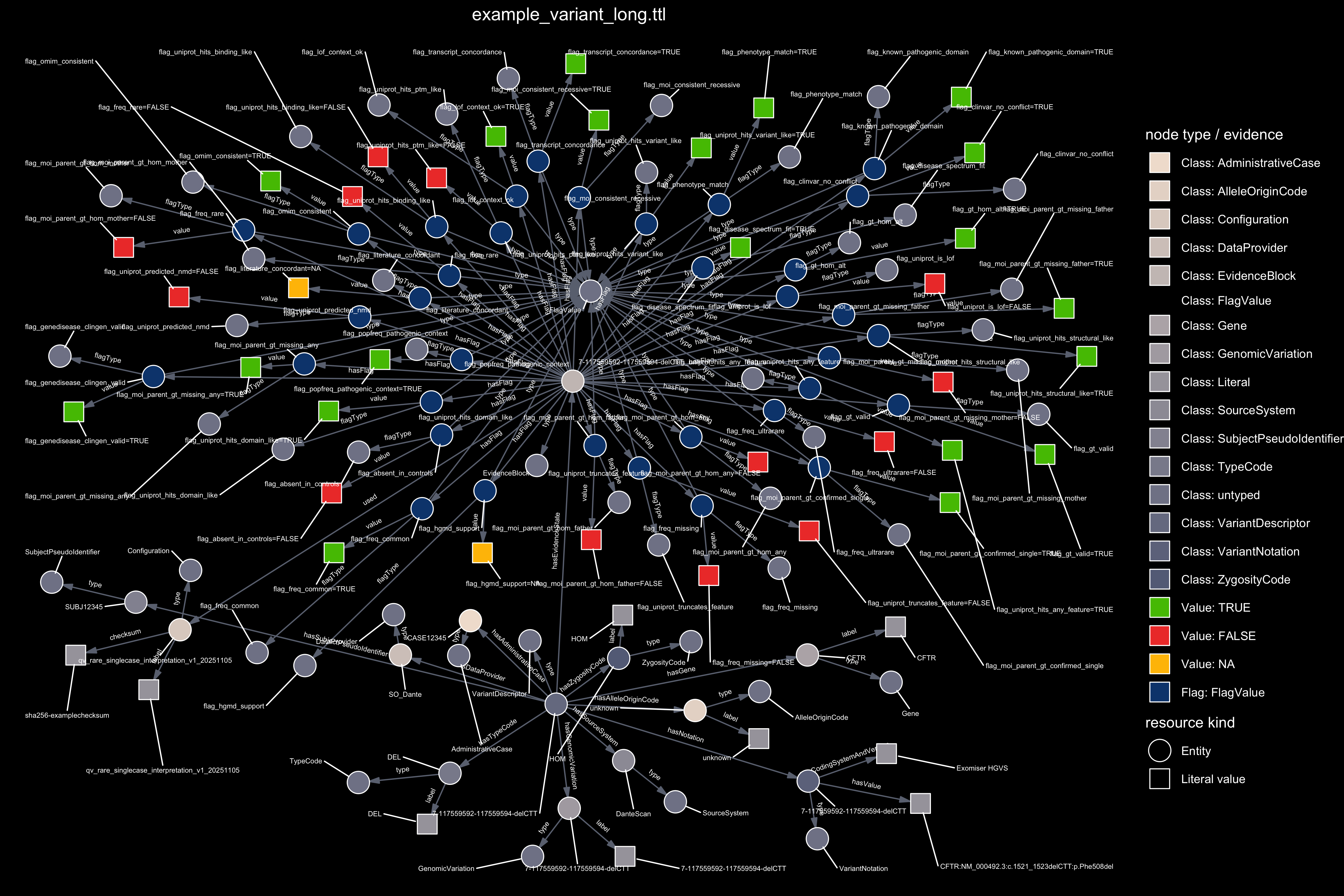 Figure 4. Graph representation of the evidence available for a single variant. The framework applies the reverse logic for clinical genetics: instead of re-questioning whether a variant is pathogenic, we quantify how much verifiable evidence is present to support interpretation. The first panel uses TRUE, FALSE, and NA. to illustrate a minimal example with three evidence flags. The second panel shows the full evidence set produced for the same variant.