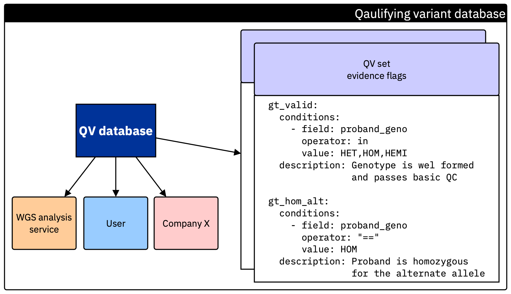 Figure 1. Shared QV configuration registry. Public or private QV sets define the consensus minimal evidence rules in a portable, versioned format. WGS providers, clinical users, and companies all draw from the same QV database, ensuring that evidence checks are reproducible, transparent, and aligned across independent pipelines.