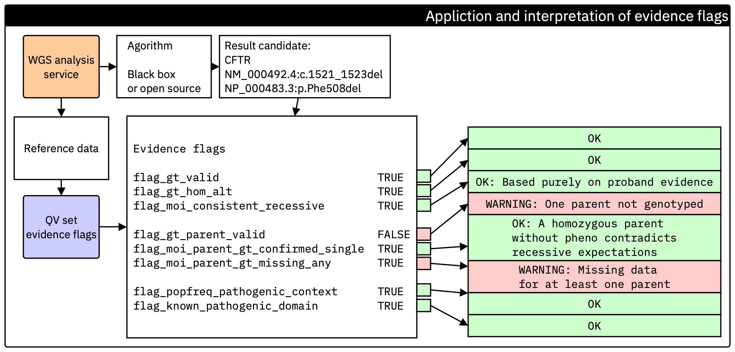Figure 2. Generation of the evidence flag set at the end of secondary analysis. Each flag is computed directly from reference data and standard checks, independent of the calling algorithm. These flags are then carried forward into tertiary interpretation so that end users can verify the essential evidence without access to the upstream pipeline.