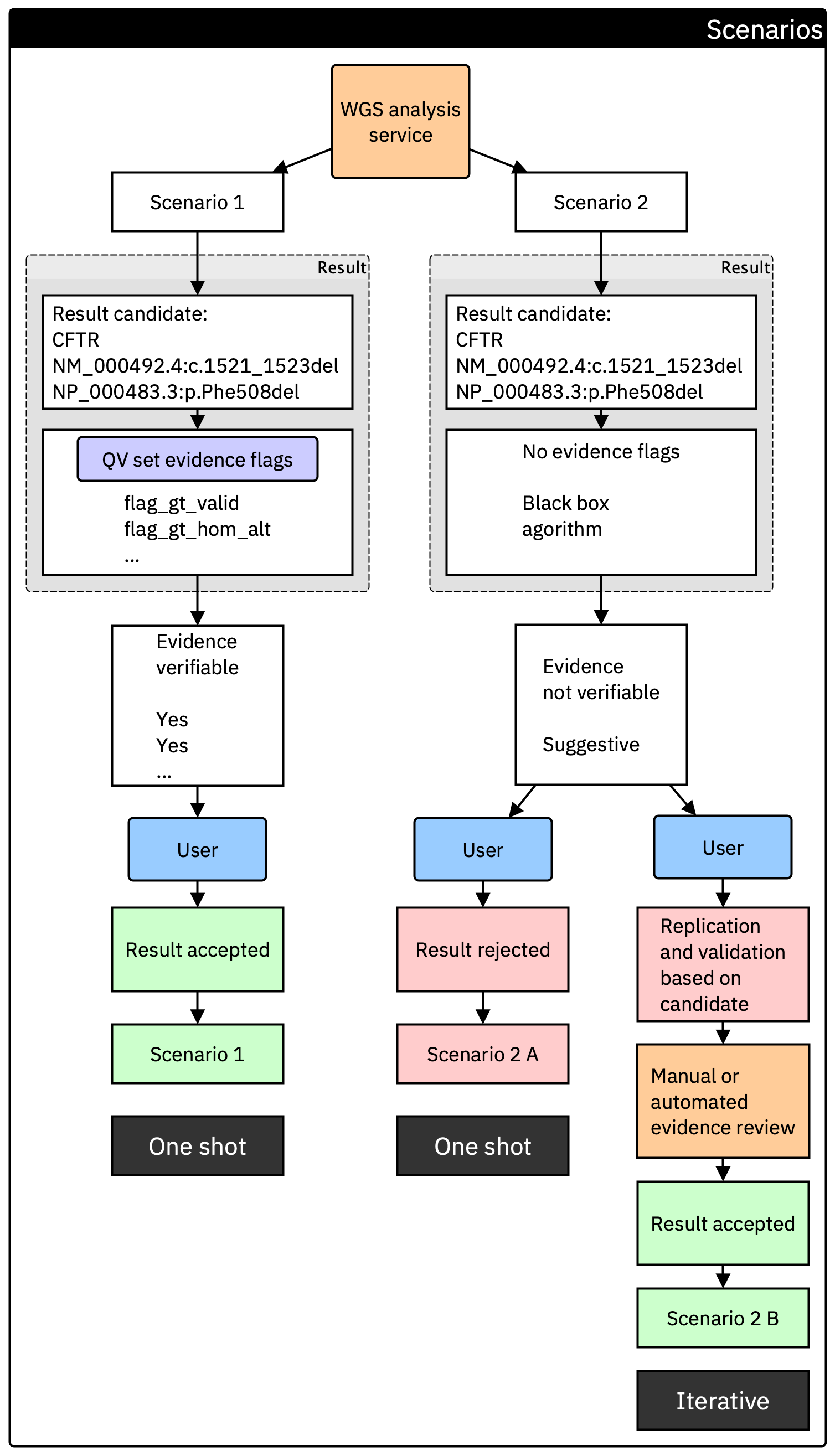 Figure 3. Comparison of two result pathways from a WGS analysis service. In Scenario 1, the provider supplies the minimum evidence flag set, allowing the clinical team to verify the candidate variant in a single step (one shot). In Scenario 2, no evidence flags are provided. The result is either rejected outright or must undergo additional replication and validation, creating an iterative decision process where each variant may need re-evaluation.
